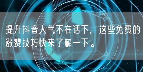 通过以上技巧的学习和实践,相信你已经掌握了如何提升抖音人气的方法。记住,要想在抖音上获得成功,需要不断学习和尝试新的方法,不断优化自己的内容和互动方式。最后,希望这些免费的涨赞技巧能够帮助到你,祝你在抖音上取得更大的成功!